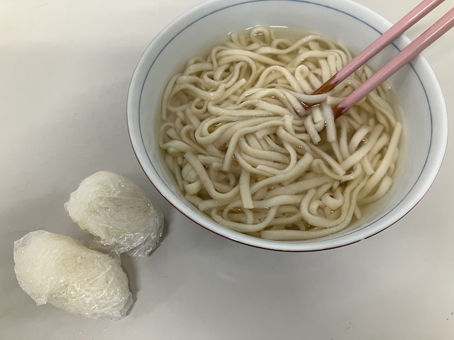 今朝は、素うどんとおにぎり。