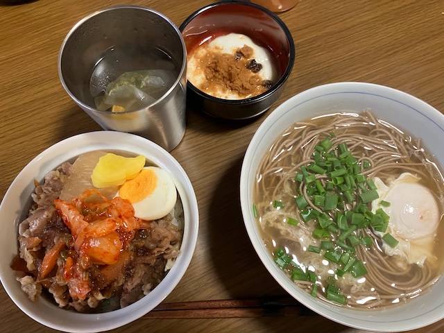 お昼は焼肉丼と月見そば。
