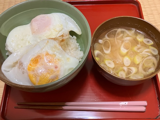 片方はいい感じに半熟になりましたが、片方は堅焼きになっちゃいました。