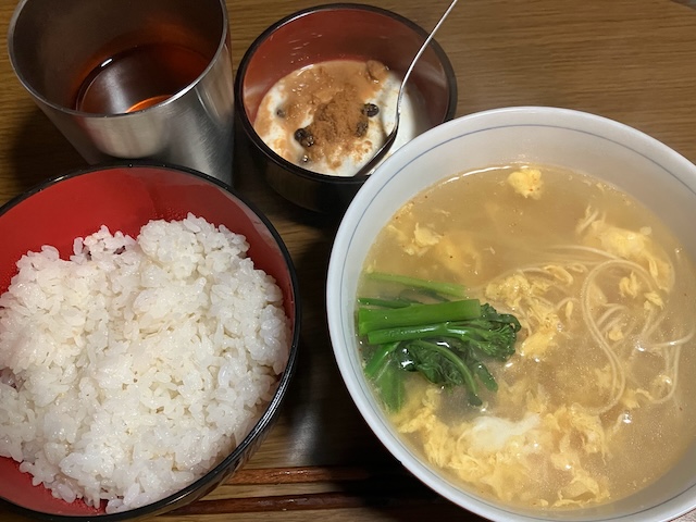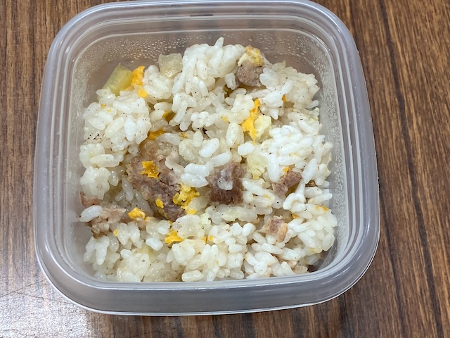今朝は炊飯器チャーハンを冷凍して持って行って、レンチンして食べました。