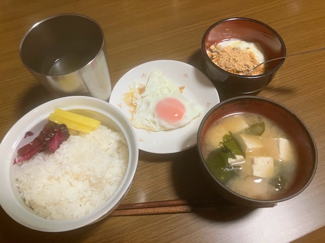 ご飯、味噌汁、漬物の3つが揃うと豪華な気がします。