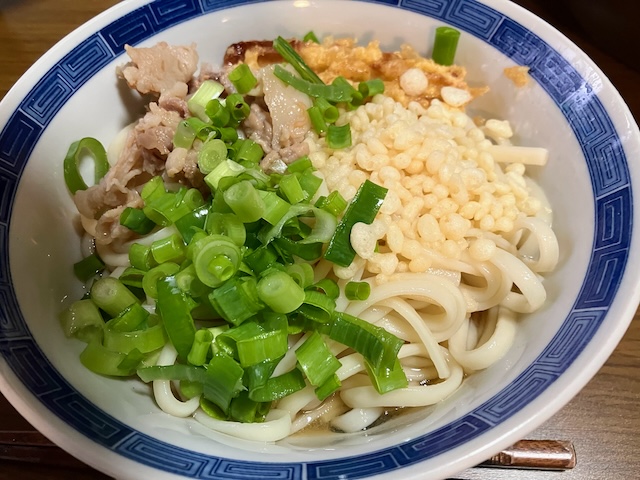 - ぶっかけうどん(豚肉、ねぎ、天かす、ちくわの天ぷら乗せ)