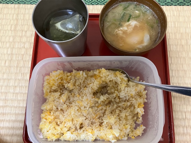 今日の昼食用に作り置きして冷凍していた炒飯ですが、お昼と晩御飯を別に作ったので朝ごはんに食べることにしました。