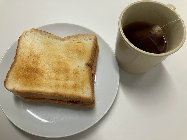 コーヒーをたてるのも面倒くさく、冷凍していたジャムパンとティーバッグの紅茶で簡単に済ませました。