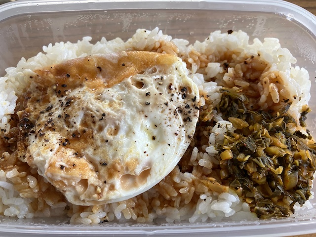 写真では、目玉焼きと辛子高菜とご飯しか写っていませんが、タッパーの底にちゃんと肉野菜炒めが隠れています。