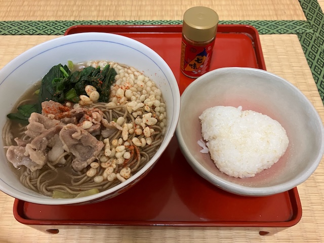 昨日は残業して遅くなったので、「肉蕎麦」と「塩むすび」。