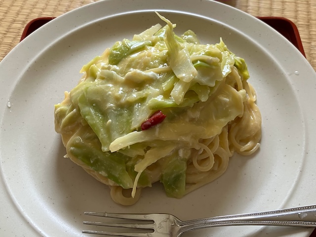 キャベツと卵を使って簡単に、「キャベツのぺぺたま」にしました。