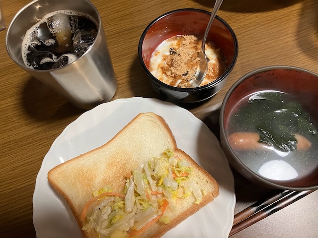 今日は、昨日妻が作った白菜のコールスローをトーストにサンド。
