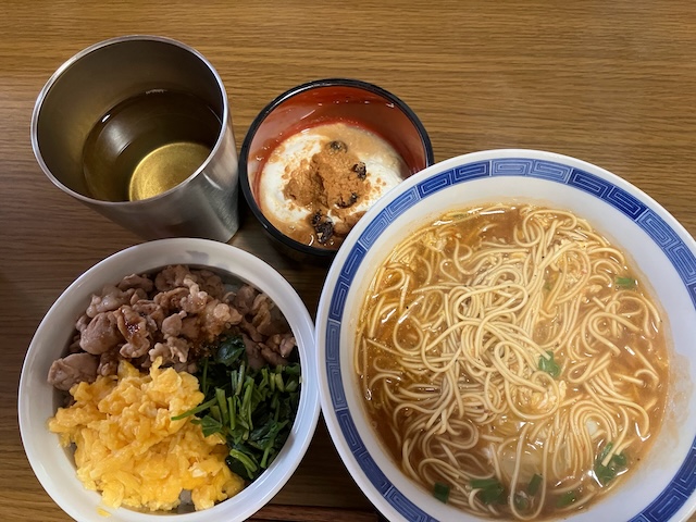 - 3色丼(豚こま肉、スクランブルエッグ、ほうれん草のおひたし)